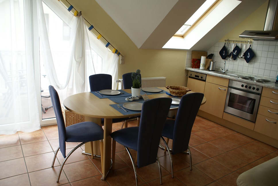 – komplett ausgestatteter Küchenzeile mit E-Herd, Mikrowelle und Geschirrspüler